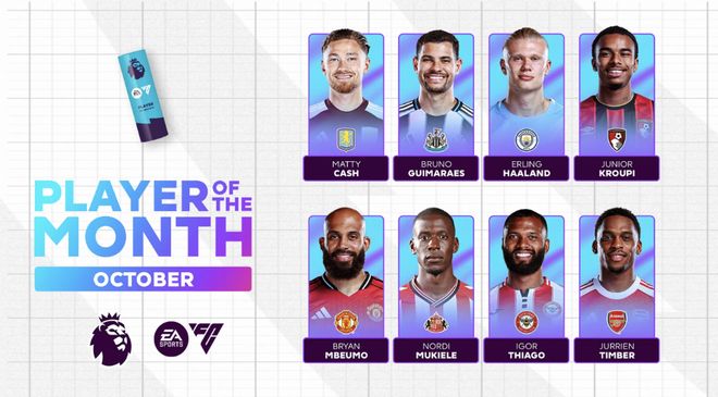 雷速體育10月30日訊 英超官方公布了10月最佳球員的候選名單,其中,哈蘭德、姆伯莫、廷貝爾、吉馬良斯在列。